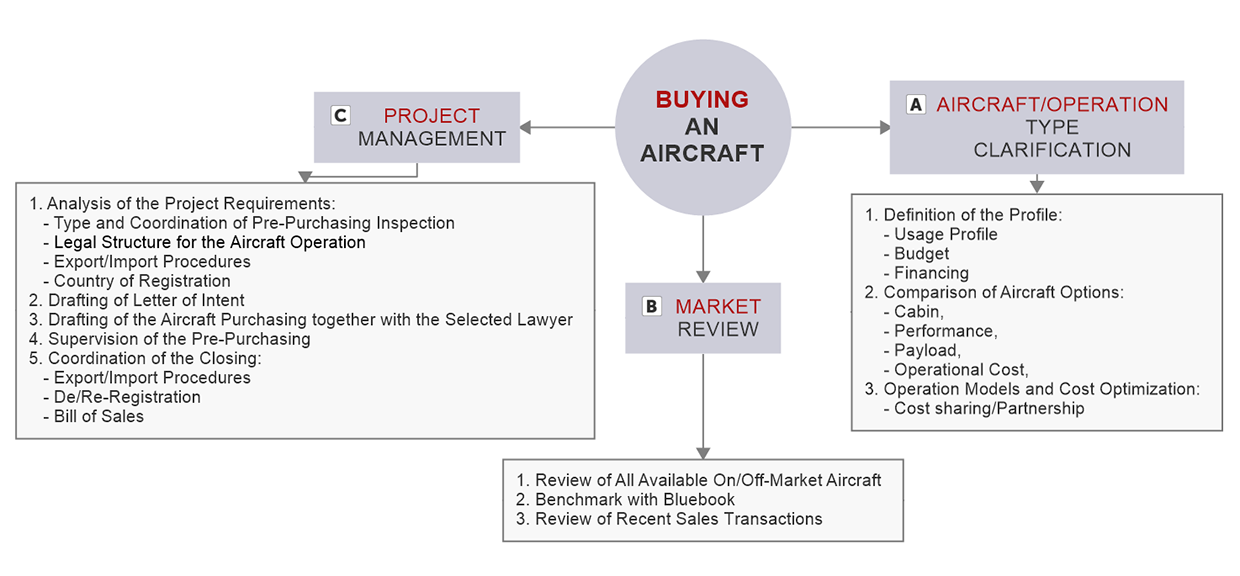 - With our experience and knowledge we are able to provide a full aircraft acquisition service, from a comparative and competitive analysis of your requirements matched to the available aircraft in the market, search and identification of suitable aircraft, a market summary, a full aircraft survey, purchase negotiations, specification compliance, pre-purchase check, acceptance, registration and introduction to service.