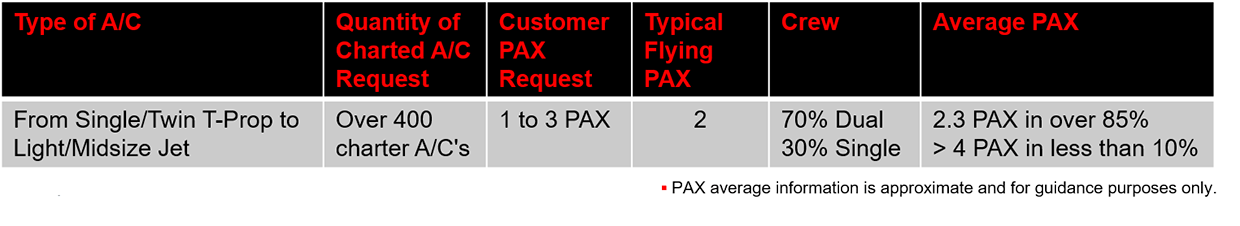 The experience of our partner EUROSHUTTLE offering charter services demonstrates in the following table the typical number of transported passenger having an impact on the size of an airplane.